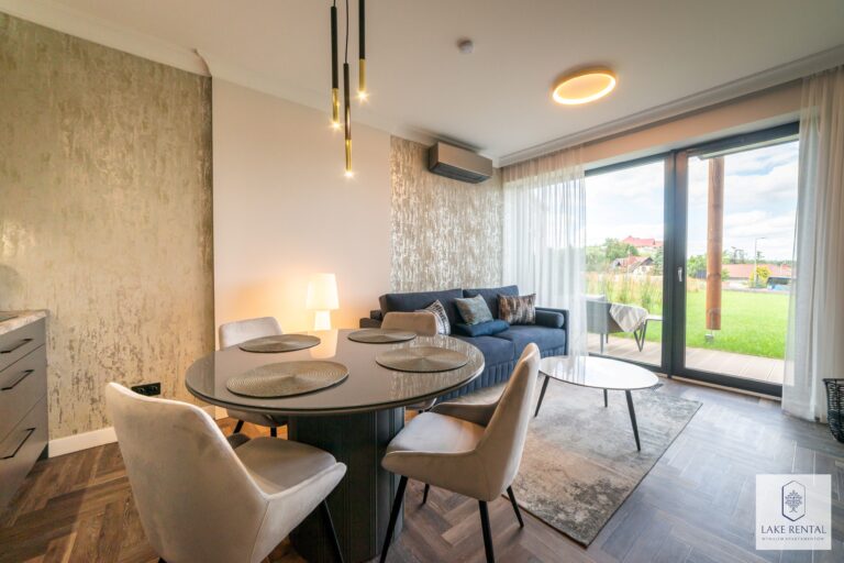 The main part of the apartment is a living room with a kitchenette, both from the living room and the bedroom you can access the terrace and the garden. From here you can admire the view of Lake Tałty.